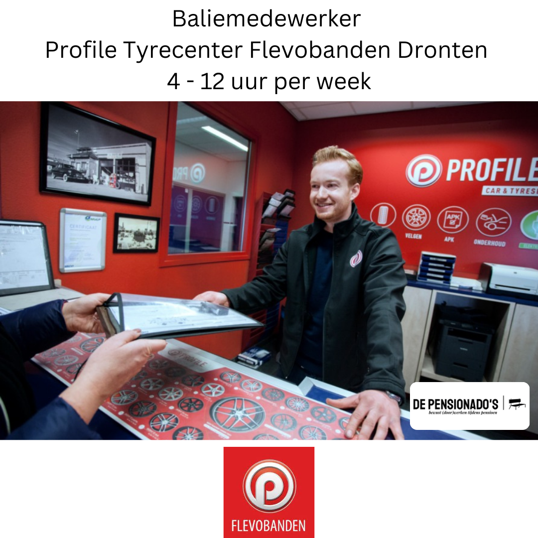 Voor de vestiging in Dronten zoeken we voor de zaterdagochtend (4 uur) een gepensioneerde Baliemedewerker. Jij adviseert met een glimlach. Want als Baliemedewerker ben jij het gezicht van jouw Profile vestiging. Verkopen doe je alleen als het écht nodig is; je bent meer adviseur. Daarnaast houd jij het overzicht en zorg je dat alles in de werkplaats op rolletjes loopt. Zo verlaat de klant altijd met een tevreden gevoel de garage.