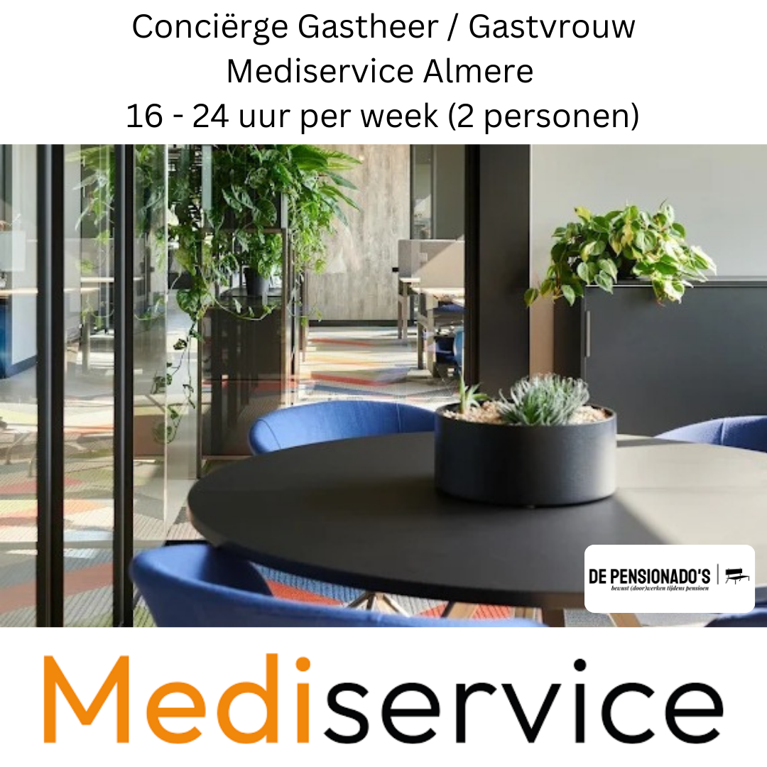 Voor het hoofdkantoor van Mediservice in Almere zoeken we twee gepassioneerde gepensioneerden die samen de functie van Conciërge c.q. Gastheer / Gastvrouw willen bekleden.