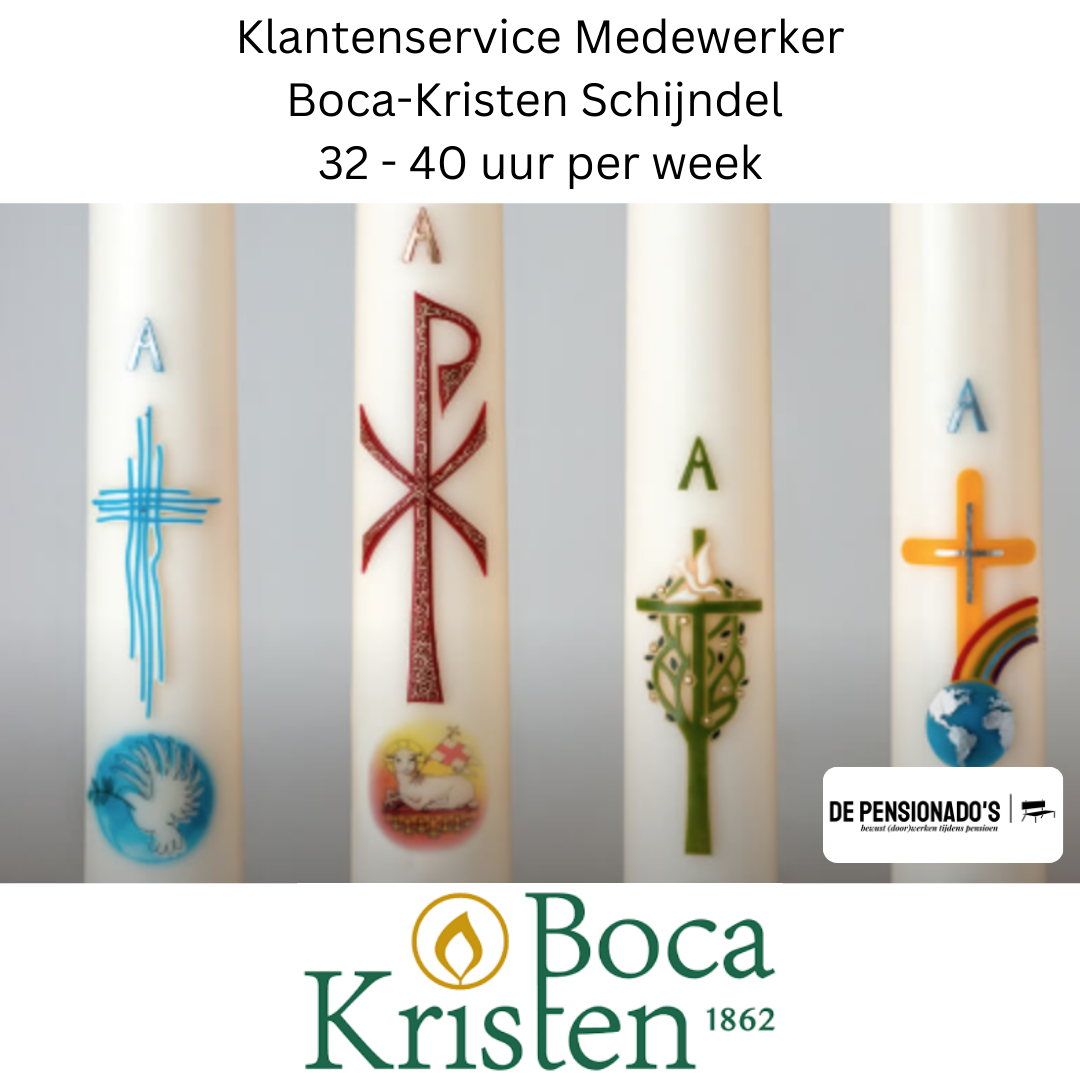 Voor het bedrijfsonderdeel Boca-Kristen in Schijndel zoeken we tijdelijke versterking voor de drukste periode van het jaar: Pasen. Hiervoor zijn we op zoek naar een gepensioneerde Klantenservice Medewerker die hen van medio februari tot en met eind mei kan ondersteunen.
